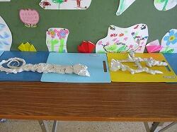図工「ふわふわ空気のつみ木」の作品をもった3年生です。実物をさわりながらものを作るという経験が少ない今の子どもたちには楽しい体験だったようです。2時間では足りないぐらいの楽しさでした。