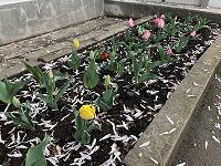 ▼花壇のパンジーは、いきいきと葉を広げ、花を咲かせています。チューリップも、伸びて、いろいろな色の花が開いてきました。