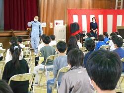 放送室から放送を流し、それぞれの教室では、プレゼンテーションのスライドや動画を、テレビ画面で見てもらうというやり方です。