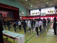 【入学式】体育館で、間隔をあけて座り、窓を開けて換気をしながら開会しました。もちろん、会場に入る人は全員マスクを着用しています。ご協力いただき、ありがございます。