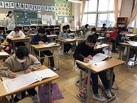 各会場では、“密”にならないように間隔をあけて座席を配置して着席し、試験用紙を配付して事前準備を行い、少し時間が余った会場では、「おさらいタイム」として、練習問題にみんなでチャレンジして過ごしていました。