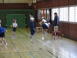 大まかな動きをみんなで確認したら、柔らかいボールを使って、実際に投げてみます。