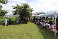 赤渕川用水池到着ボランティアの皆様にご協力いただいて、はったテントの下で挨拶を聞きます