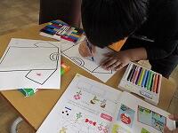 とクラスのお友達と尋ね合いながら、Tシャツを作り上げていく活動です。