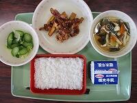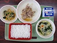 ごはん ビビンバの具 もやしと小松菜のナムル 卵とわかめスープ 牛乳