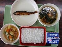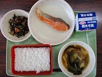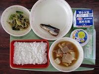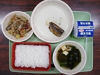 ごはん やしおますのしおやき ひじきと厚揚げの煮物 玉ねぎとじゃがいもの味噌汁 牛乳