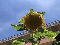 昨日の豪雨にも負けず、校庭のひまわりは、頭を垂れながらもしっかり根を張って立っています。