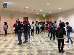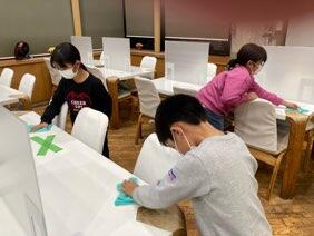 感染症対策で話合いの輪を大きくし、それぞれが意見を交わして班長がまとめ、グループごとに発表をしました。