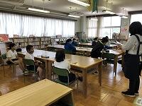 今日から、図書室の利用が始まりました。クラスごとに、授業の時間に図書室に移動して、「オリエンテーション」を行い、図書事務の先生から、利用の約束やノートの使い方などの説明を聞きました。その後、本を選んで貸し出し・・・感染症対策で、間隔をあけて並んで、アクリル板をはさんで、先生や図書委員さんの「ピッ」というバーコード読み込みをしてもらいましょう。