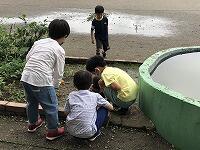 アサガオの葉っぱに、緑色の虫を発見!! アサガオの葉っぱと同じ色なので、先生はなかなか見つけられなかったのですが、「ほら、ほら~ここだよ!!」と、子どもたちに教えてもらって、カメラを向けました。すると、ぴょ~んっと跳ねて、地面に…「つかまっちゃうよ~、大変だ!!」と、逃げ出したのかな?それにつられて、子どもたちも、ぴょ~んっと、虫と一緒にはねて・・・本当に、子どもたちはかわいいです。「踏んだら、かわいそうだよ!!」という声も聞こえてきて・・・本当に、子どもたちはやさしいです。