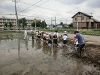 田村さんのご厚意で田植えの体験をさせていただきました。子ども達は初めての泥の感触に驚いたり、深く入った足を動かすことに四苦八苦したりしていました。