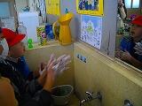 雨のため校庭では遊べないので、昼休みにじょうずな手の洗い方を練習しました。