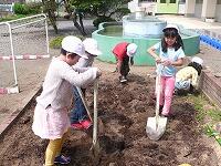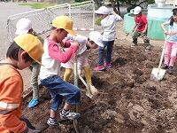 校長先生の力を お借りしながら、畑に堆肥を入れて栄養満点の土を作りました。