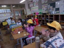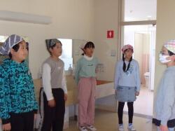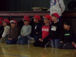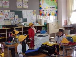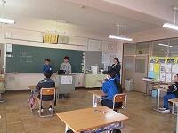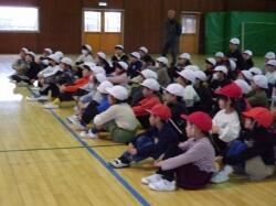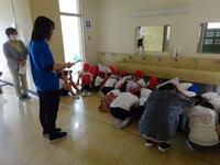 まず、竜巻の避難訓練の様子をご覧いただきました。子どもたちは、素早く自分の身を守る待避行動を取ることができていました。委員の皆様にもお褒めの言葉をいただきました。