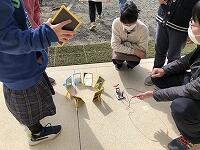 6年生が、昇降口で理科の学習をしていました。時々雲に覆われてしまう太陽の光