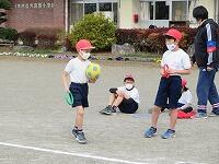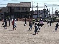 複数の学年の子どもたちが、仲よく楽しそうに遊んでいる、本校ならではの光景に、ほっこりした気持ちになって、カメラを向けました。よ~く見ると、ドッジボールとドッチビーが何個か飛びかっていましたよ!! なかなか、おもしろそうなルールを工夫していますね。