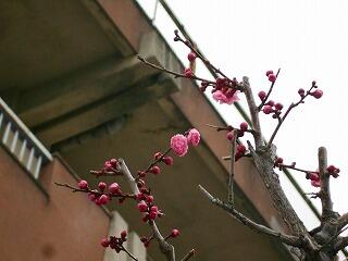 ▲技能員の先生が、校庭の桜の枝を切って、暖かいところで数日育てて、当日の朝、ちょうど開花させて昇降口前に飾ってくださいました。