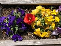 ▼花壇のパンジーは、いきいきと葉を広げ、花を咲かせています。チューリップも、伸びて、いろいろな色の花が開いてきました。
