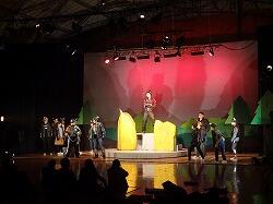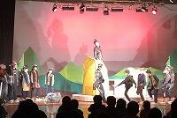 物語は進んで、1幕後半、主人公のガブがオオカミの仲間に取り囲まれ、無理矢理、決闘をさせられる場面。6年生全員がオオカミの衣装で登場し、群れの仲間の役を熱演しました。