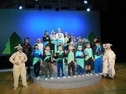 出番を控えた子どもたちの緊張とワクワクのなか、きむらゆういち(作)・あべ弘士(絵)の絵本を原作とした「あらしのよるに」の開演です。