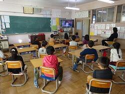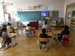 校長先生と代表児童は校長室で準備、他の児童たちは教室で開式を待ちます。(接続確認に少し時間がかかりましたが、音声が出なかった始業式よりも順調に作業し、準備完了)