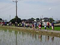 保護者ボランティアの皆様に見守られながら、学校を出発して、「赤渕川用水池」まで歩きました。