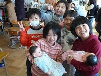 赤ちゃんのお人形をうれしそうに抱っこする子どもたち