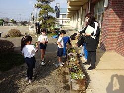 昇降口前です。春らしさを感じる入口になりました。晴れの日を祝って技能員の先生が桜の枝を届けてくださいました。また、コブシを剪定したときにとっておいた枝も飾りましたよ。プランターのパンジーは、美化・緑化委員会の皆さんが育ててきた物です。(終了後、ここで記念写真を撮る保護者が多かったですね。