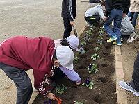 ▼先日3年生が植えてくれたパンジーの間に、5年生がチューリップの球根を植えてくれました。
