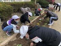 ▼技能員の先生と栽培担当の先生に、植え方を教えてもらいながら、「深~く穴を掘って」「球根の向き」に気を付けて植えました。