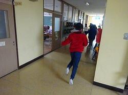 校内に不審者が侵入したという意味の放送を聞いた児童は、不審者を刺激しないよう、静かに避難します。