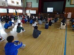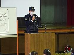 訓練の後は、不審者が学校に侵入した場合の対処法についてのDVDを視聴し、さらに、学校外で不審者に遭遇した場合の注意点について紙芝居やクイズを通して、ご指導をいただきました。