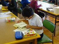 5・6年生になると、ずいぶんスピードアップしますね。出題される言葉の意味を、あっという間に探して、解答用紙に記入していました。制限時間内に全問引けた「辞書引き名人」として、『認定カード』をいただき、うれしそう