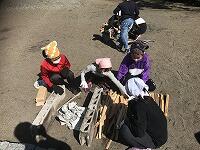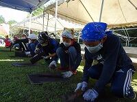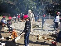 班で協力して薪をくべて、火を起こします。すすで顔が真っ黒に!