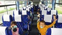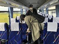 ▼バスの座席は一人ずつで、しっかり間隔を空けて…。