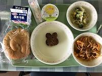 メニュー:ミニはちみつパン、スパゲティナポリタン、ハンバーグ(ナント!!うさぎ型♥)ゆで野菜サラダ、牛乳、十五夜デザート