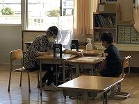 一つのテーブルに2人で距離をとって「いただきます!」食事係と保健係の児童は消毒をしてくれています。