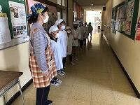 ▼配膳室に移動すると、1列に並んで、学年を言ってあいさつをします。しっかり間隔をあけて並びます。