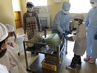 ▼配膳員さんに手伝っていただき、自分の担当のものを受け取って、気を付けて教室まで運びます。