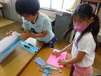 短冊グループでは、どれくらいの大きさにしたらいいか話合い、人数分の短冊を切り分けました