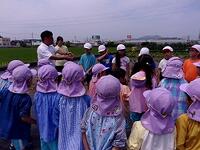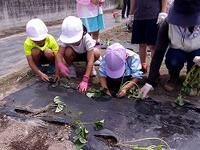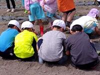 けやき保育園の園長先生に苗の植え方を教わり、保育園の園児達と一緒に苗を植えました 苗を横にして植えるのは難しかったようですが、さすが2年生。園長先生の話をよく聴いて、上手く植えることができました