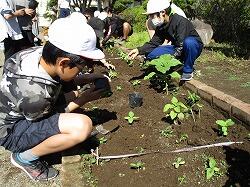 花壇の前に芽吹いたひまわりが準備されています。最初に担当の先生から植え替えのポイントについてお話がありました。