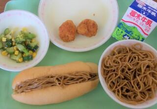 今日の給食のメニューは焼きそばですが、コッペパンに切れ目が入っていて、焼きそばパンにすることができます!