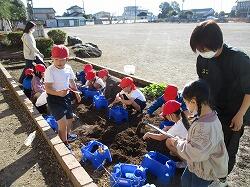 星よいしょ!よいしょ!土をたっぷり入れますよ。笑う担任の先生からお話を聞いてひらめき1人1個、球根を植えます。イベント「チューリップの球根大きいねニヒヒ」みんなびっくり汗・焦る