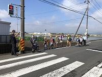 ▼地域の方に見守られながら、元気に歩いて登校する子どもたち…
