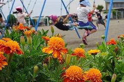 花丸いよいよ開花しました。期待・ワクワク校舎前のひまわりと一緒に学校を明るく彩ってくれています。キラキラ