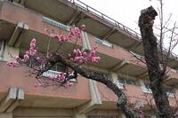校庭の紅梅も、雪に負けず美しく咲いています