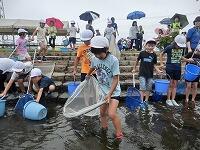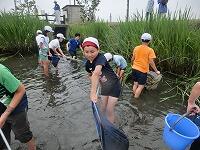 川に入り、生き物調査のためいろいろな生き物を探します!