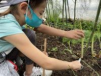 ▼一人が茎を支えて、もう一人がひもでしばって…協力!