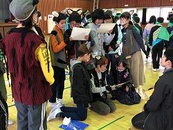 5・6年生は歌うだけでなく、ステージに上がる場面もあります。衣装を着けて、歌う場所や、せりふに合わせた動きを確認しながらの練習でした。